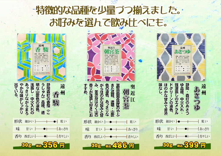 私どもの店舗で、お客さまに支持されているお茶をお試しサイズにセットにしてみました。
